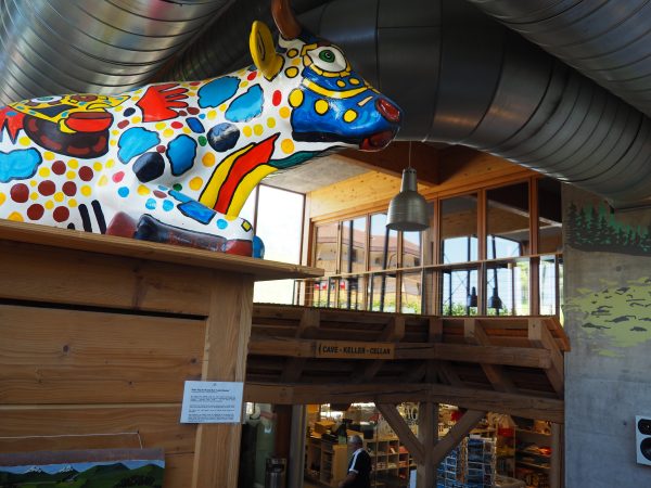 Esta famosa fábrica de queso es toda una atracción turística. En su página web podéis conocer todos los detalles sobre su historia. Al llegar, unas señoras «muy suizas» ataviadas con típicos vestidos tradicionales os atenderán. La entrada incluye la audioguía que os explicará toda la información del recorrido por la exposición. Además, os regalarán una muestra de quesos gruyère de diversa curación para poder saboerearlos durante la visita. La narradora del audio es una simpática vaca que os irá contando cómo viven las vacas en Suiza, cómo afectan diversos factores a la producción de leche y cómo se fabrica el queso.